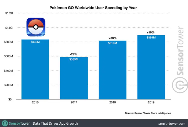 除了《宝可梦:剑/盾》带来的收入激增外,《Pokemon Go》的收入在2019年也获得了增长,市场调研机构SensorTower的数据显示,《PokemonGo》2019年总收入达8.94亿美元的消息,较2018年的7.95亿美元增长12%。