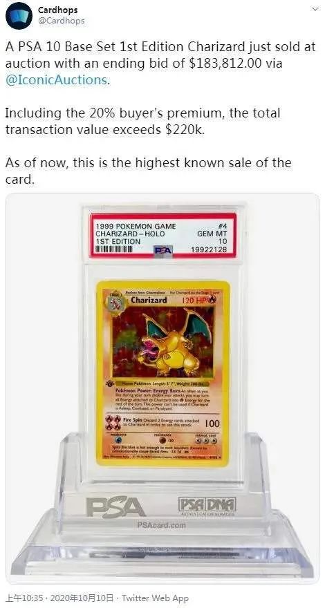 值得注意的是,这还不是最贵的宝可梦卡,最贵的宝可梦卡牌是一张日版插画师皮卡丘,它在今年早些时候以超过23.3万美元的价格被成交。