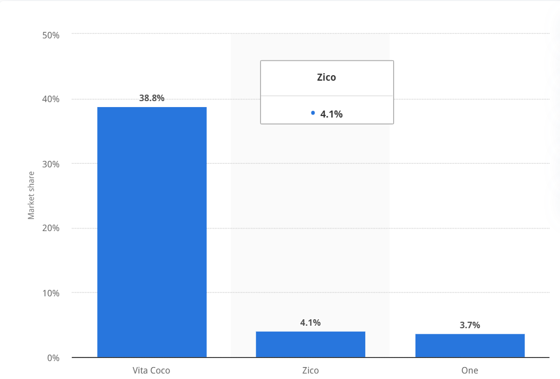 很长时间,Zico都是公认的椰子水No.2地位,市场份额自从被收购一直维持在20%左右,(全球最畅销的椰子水品牌是Vita Coco,百事曾经也想买下来)这本来是不错的成绩,但在最近3年,Zico的市场份额大幅下滑。据Statia,Zico的市场份额仅剩4%,一些小众便宜的椰子汁品牌后来居上,蚕食了Zico的生存空间。