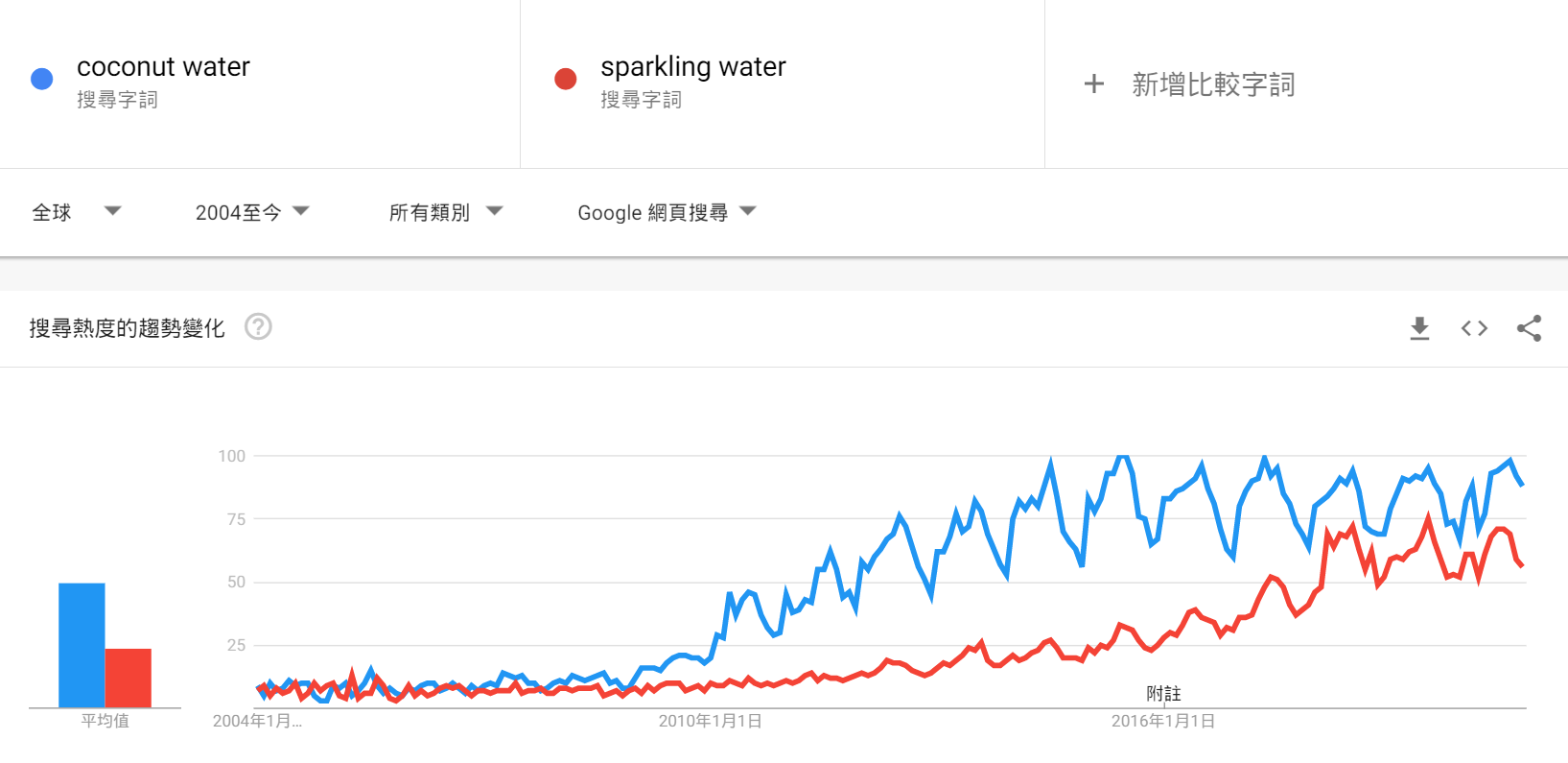Google Trends显示,椰子水的全球搜索热度多年来未见上涨