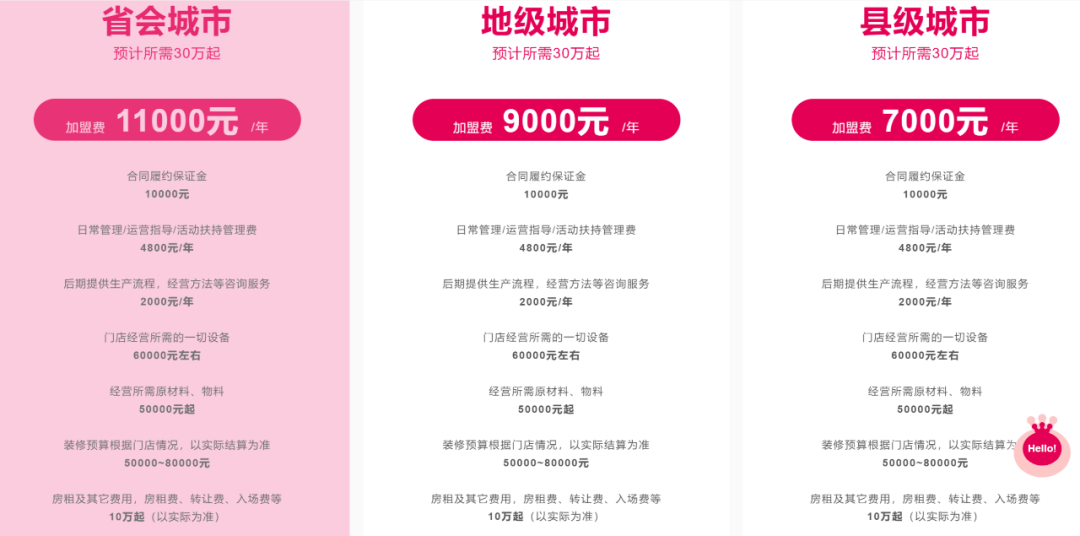 加盟费并不便宜,蜜雪冰城加盟所需,预计30万起。据蜜雪冰城官网公布信息,省会城市的加盟费为11000元每年,除此之外还有合同履约保证金,日常管理、运营指导、活动扶持管理费,设备、物料等费用。