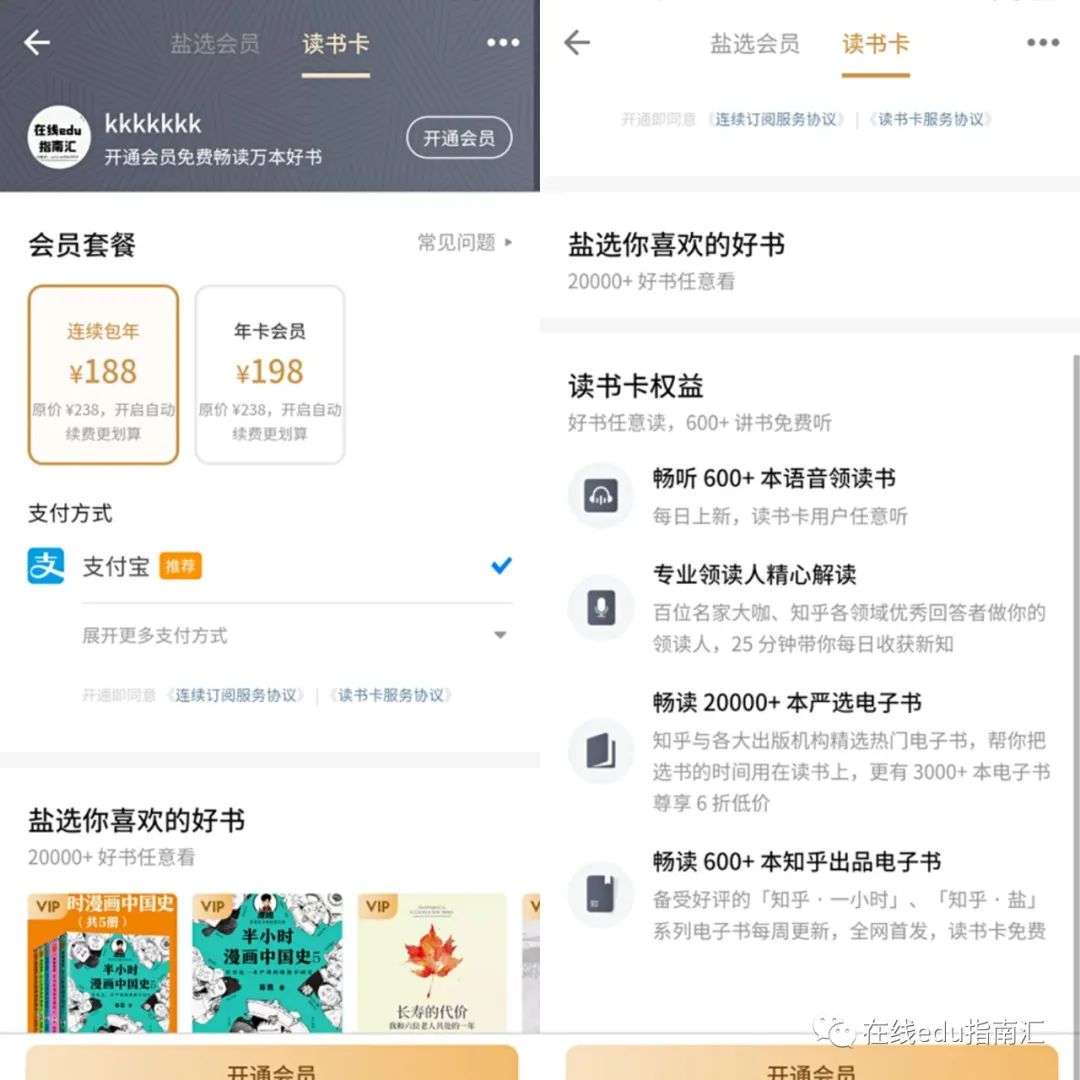 知乎盐选会员的权益:知乎盐选专栏内容、live讲座、私家课、电子书等。读书卡的权益主要是电子书。