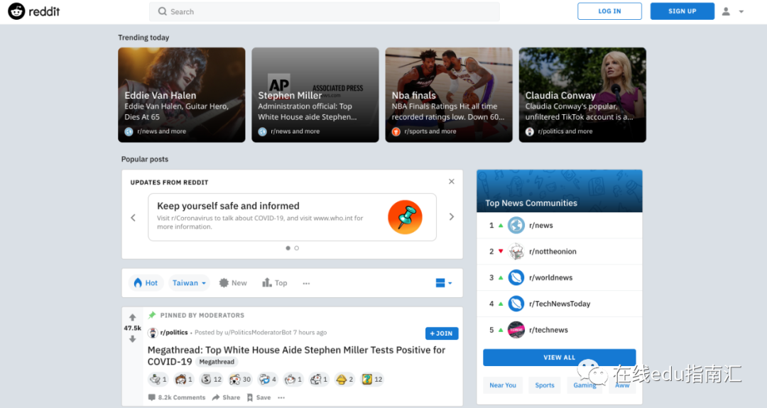 它不仅有基于社交的问答“帖子”、还有新闻。从它目前的slogan是 :the front page of the internet(互联网首页),也可以看到:即时、流行(trending today)的新闻属性。根据wiki信息:Reddit目前是美国第五大网站,流量仅次于Google、YouTube、Facebook以及Amazon,月活用户数达3.3亿(2020)。