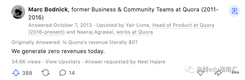 Quora上的一个问题:“ Quora是否没有任何收入” ,当时(2013)的一位员工回答道,“ 我们没有产生任何收入”。:)