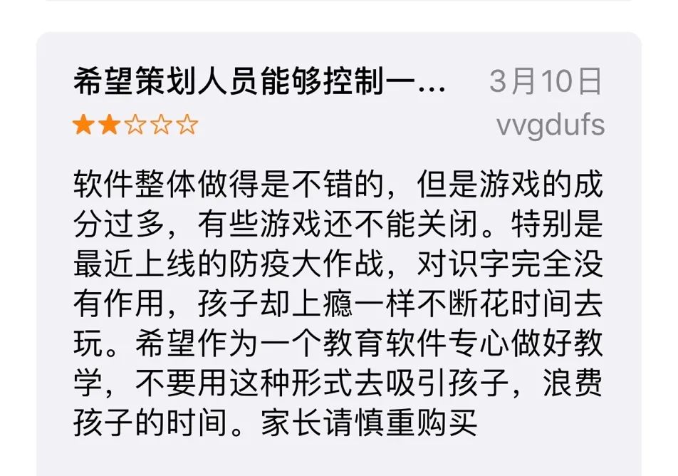 洪恩教育试图以“游戏教育”的概念打开市场,但至于是学习大于游戏,还是”披着学习外衣“的游戏,用户最有发言权。一些家长在产品反馈中指出,洪恩识字的游戏成分过于浓重。