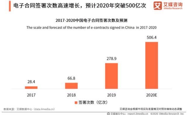 据艾媒资讯显示,2019年中国电子合同签署次数高达278.9亿次,同比增速高达317.5%。艾媒咨询分析师认为,疫情助推下,信息化改革深入开展带来的政策机遇加速推动电子签名自上而下渗透,电子合同签署次数有望持续高速增长,预计2020年将突破500亿次。