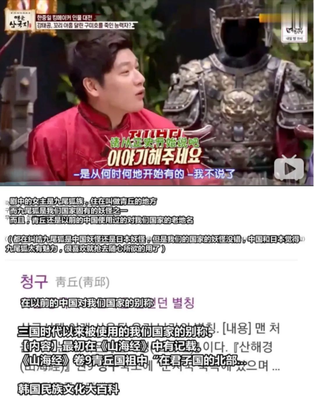 在韩国综艺《英雄三国志》里就曾对九尾狐的出处做出过讨论,张玉安提到姜子牙杀了九尾狐,韩国主持表示不可置信:九尾狐是我们国家的妖怪,怎么能被姜子牙杀掉呢?在场的日本代表附议了张玉安,但韩国主持坚持,并且试图用“我邻居阿姨都在养”的玩笑蒙混过关。