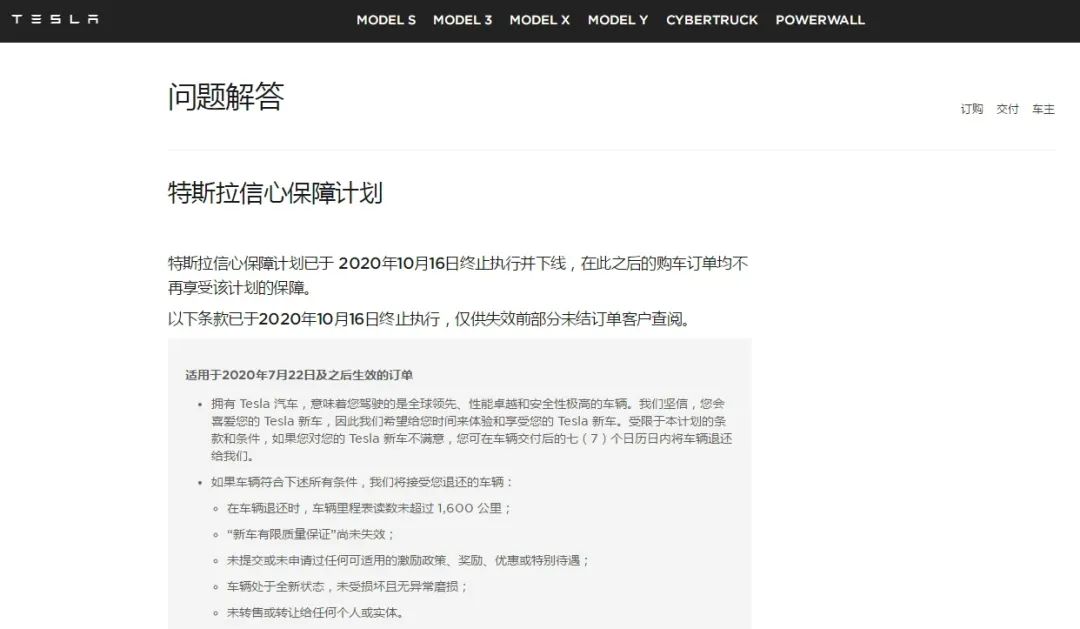 2020年10月17日,特斯拉官网问题解答页面显示,公司的信心保障计划已于2020年10月16日终止执行并下线,在此之后的购车订单均不再享受该计划的保障。