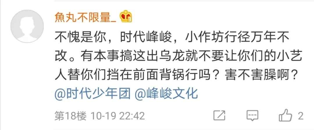 一方面是乐迷和粉丝的争执,另一方面则是粉丝与经纪公司的battle,事件中的两名偶像艺人反而处于一种置身事外的状态。这也正反映出在粉丝经济下艺人能动性的有限,甚至是"工具人"般的存在。