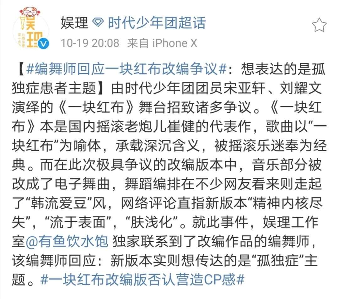 改编的歌曲足够真诚吗?单纯从内容创新的角度,即使粉丝认为"改后的版本赋予了这首歌新的灵魂",但大部分网友似乎并不买账。按照编舞师的回应,红布是孤独症患者心境的一层纱,是对原歌曲中红布这一意向的延展与创新表达。