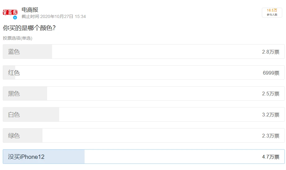 据悉,蓝色是今年iPhone的新增配色,曾被外界广泛看好,纷纷预测该配色或将为iPhone 12的主打色。来自电商报的一项投票结果显示,参与的16.5万名网友中,28%的网友表示没买iPhone 12,为选项中最多;而买了的人中选择白色的最多,其次就是蓝色了。