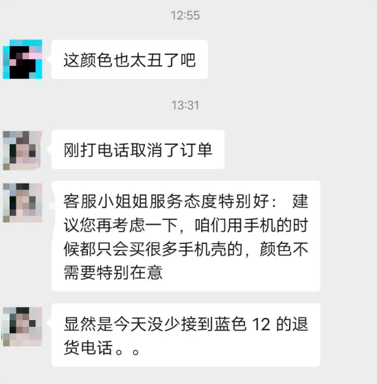 而据一已经取消订单的网友,面对蓝色iPhone 12的退货申请,客服建议“颜色不需要特别在意”,因为会买很多手机壳。