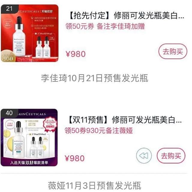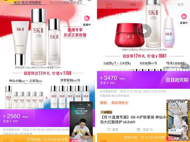以这次双11预售为例,除了同款同价的SK2神仙水单品外,薇娅还卖到手价3470元的SK2明星套装,李佳琦选的是另一个套装,到手价2560元。这两个套装中也都含有神仙水正装。