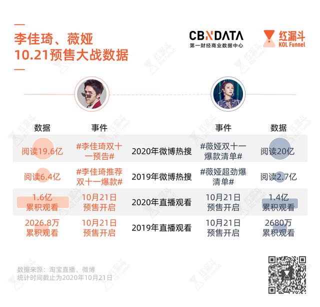 截至10月21日,#李佳琦双11预告#、#薇娅双11爆款清单#微博话题阅读量均在20亿左右。对比去年,直到双11结束,两人相关微博话题才分别拥有超过6亿和近3亿的阅读。
