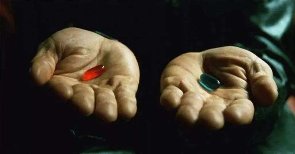 在经典的科幻电影《黑客帝国》当中,主人公尼奥面临着一次重要的抉择:在他面前摆着两颗药丸,一颗红色、一颗蓝色。红色预示着主角选择抛弃幻象、回归现实,而蓝色则意味着他将在虚拟世界中继续生存。