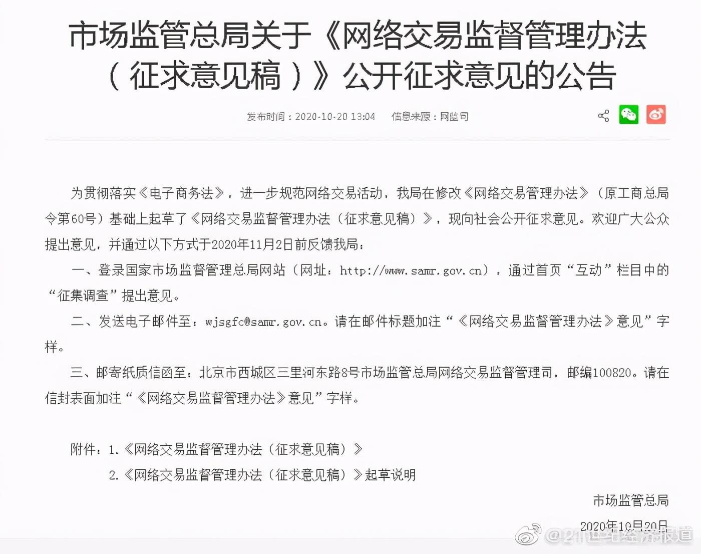 正值“提档”双十一来临之际,“市场监管总局关于《网络交易监督管理办法(征求意见稿)》公开征求意见的公告”于10月20日公布了。公告明确了网络交易监管坚持鼓励创新、包容审慎、严守底线、线上线下一体化监管的原则,着眼于促进数字经济健康发展。对于网络社交、网络直播等网络交易新业态新模式,实行包容审慎监管,留足发展空间,同时确保商品和服务质量与交易安全。