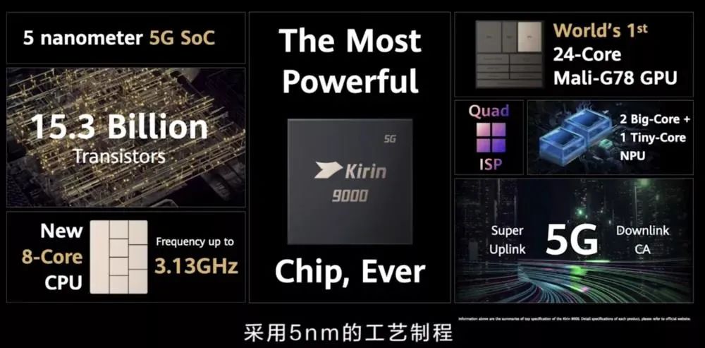 在核心硬件部分,全系搭载全新5nm 5G SoC麒麟9000处理器,华为官方表示,这颗处理器的晶体管数量达到153亿,比苹果的A14多出30%。