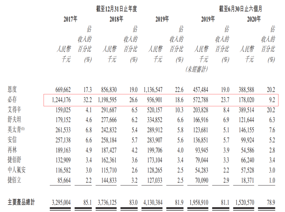 但由于“必存”在2019年被纳入《监控名录》,并在2020年被从最新的国家医保药品名录中移除,因此导致其销量从2019年开始逐渐下跌。在2020年上半年,“必存”在先声药业营收中的占比已经跌至个位数。