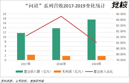 “问道系列”的毛利润走势却并不乐观。2017-2019的三年里,该系列毛利润分别为2.36亿元、1.78亿元和1.77亿元,呈逐年下滑趋势。