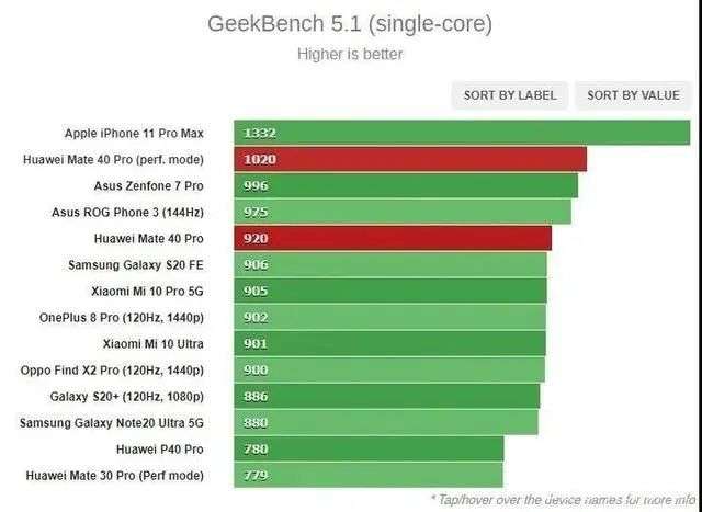 在GeekBench给出的多核CPU测试中,麒麟9000在性能模式上比去年的A13处理器高出约6%。在单核测试中,Mate40 Pro领先于骁龙865+处理器,但与A13处理器还是有一些差距,与A14的差距这里就不多讲了。