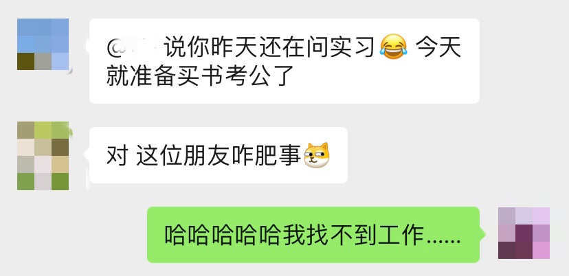 尽管公考的竞争是如此的激烈,书也还没认真看过几遍,但群里的人仍愿一试的原因,大概是他们无法忘怀被应聘和实习所支配的恐惧。