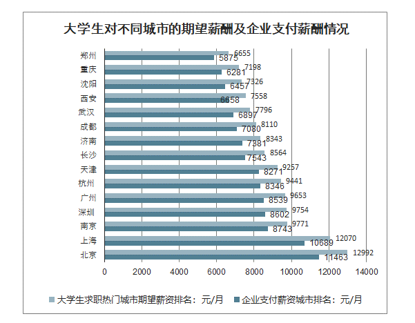 据58同城《第十六届中国大学生最佳雇主调研综合报告》显示:大学生期望薪资排名前三位的依次是北京、上海、南京,平均期望薪资分别为12992元/月、12070元/月、9771元/月,而平均期望薪资是:8431元/月,与现实情况还存在着一定的差距。