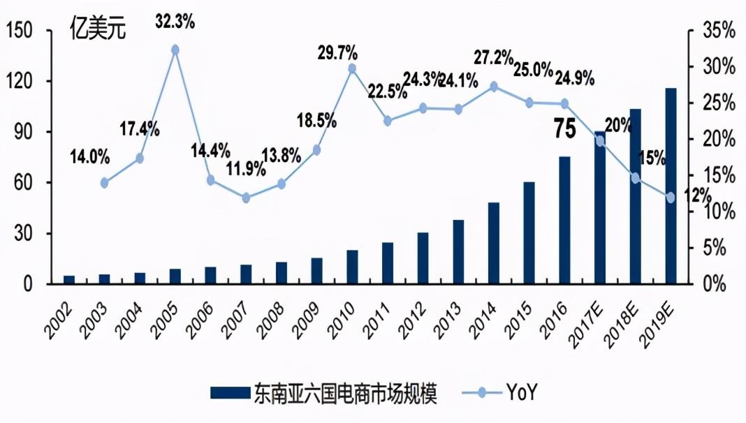在过去十年里东南亚也同样经历了经济稳健上升与社会进步带来的飞速发展,人口不断增长,中产阶层快速扩张,移动/互联网普及率也不断提高,人们的消费习惯改变,线上电商平台的消费显著增长。从2019年开始,东南亚互联网经济持续高速发展,在2019年东南亚的互联网经济达到了1000亿美元,保持现在的发展趋势,在2025年,很容易实现3000亿美元。
