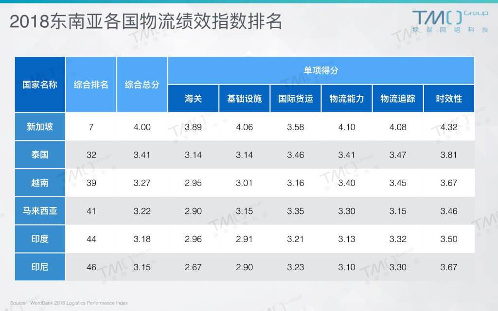 伴随着电商的迅速发展的是对物流日益增高的要求,但东南亚消费者散落各地,地缘环境复杂多变,使得物流的增速难以跟上电商的增速,可以说物流成了东南亚地区的一块心病。根据2018年世界银行的物流绩效指数排名,除了新加坡,其他国家的物流充斥着各种问题,明显难以令人满意。这也意味着在东南亚物流行业还是一块尚待挖掘的宝藏。