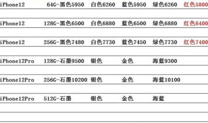 那么,严控渠道之后,线下经销商的利润保住了吗?一位深圳华强北的苹果经销商向懂懂笔记提供了一份目前iPhone12系列的价格明细。其中的各型号价格显示,目前华强北在售iPhone 12已经破发,部分颜色甚至已经降至6000元以下(64G红色款仅5800元)。