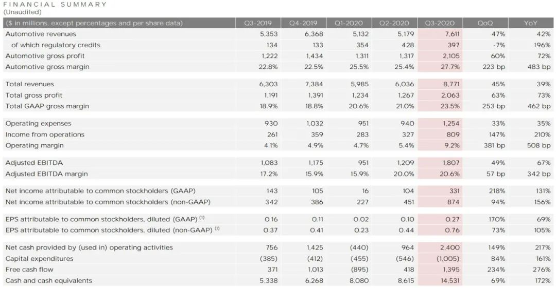 有了交付和销量上的基础,特斯拉三季度的营收数据和净利润也实现了大幅度的增长。据财报数据,总营收达到87.7亿元,同比增长39%,其中整车营收占总营收的83.7%。归属于普通股东的净利润方面,达到了8.7亿美元,同比增长157%。
