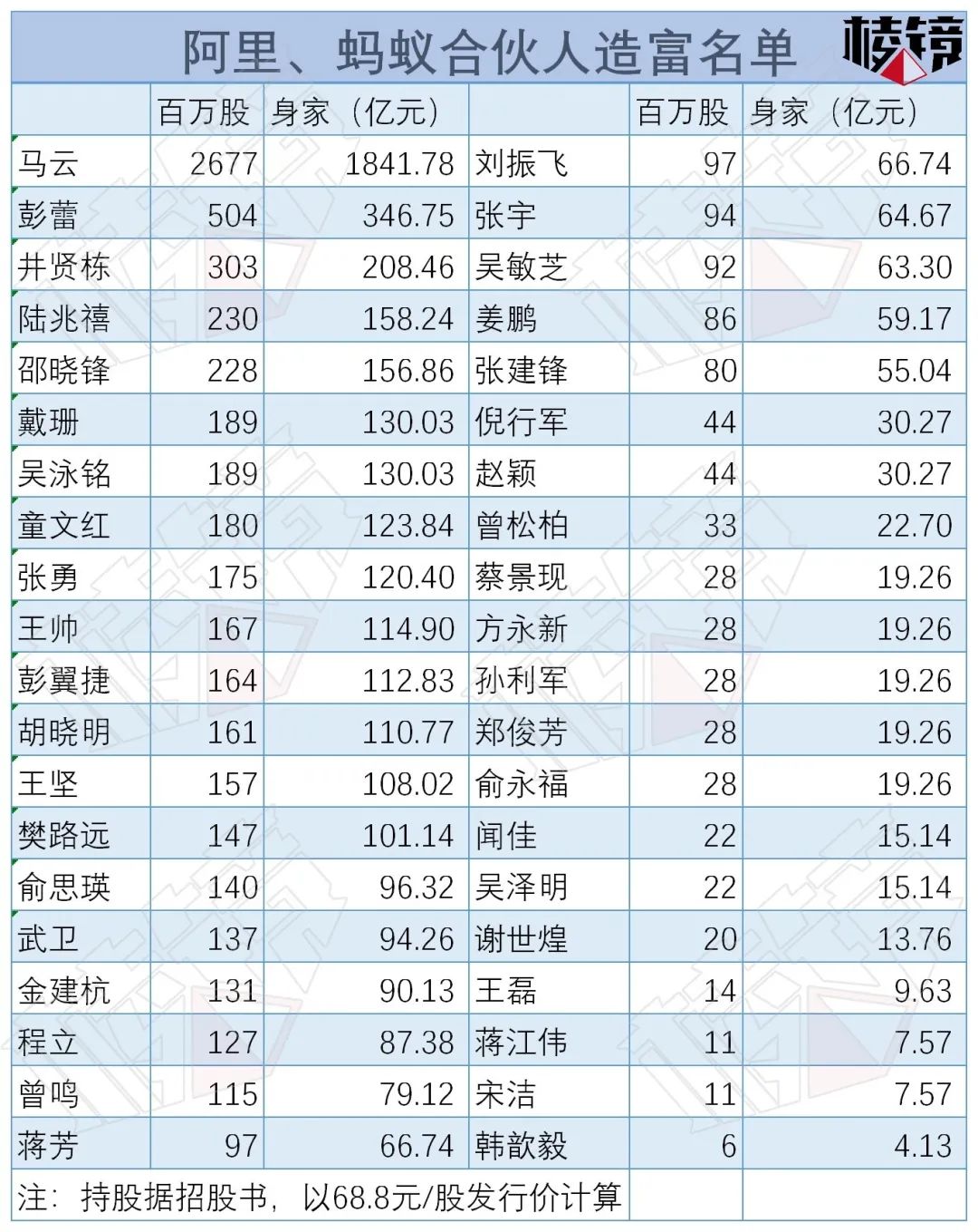 其中,阿里巴巴联合创始人谢世煌认缴出资额最少,但他享有的股份数为2000万股,对应股权价值达13.76亿元。40位合伙人中,最少的持“股”价值也超过4亿元。