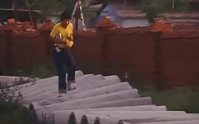 《父与子》中,儿子拿着父亲给自己买参考书的钱去买一堆零食,他怀里抱着吃的,去见心仪女生的路上,嘴里啦啦着唱歌,在一排空心的水泥管上跑着、跳着,肩膀也一耸一耸的,不禁让人发笑。