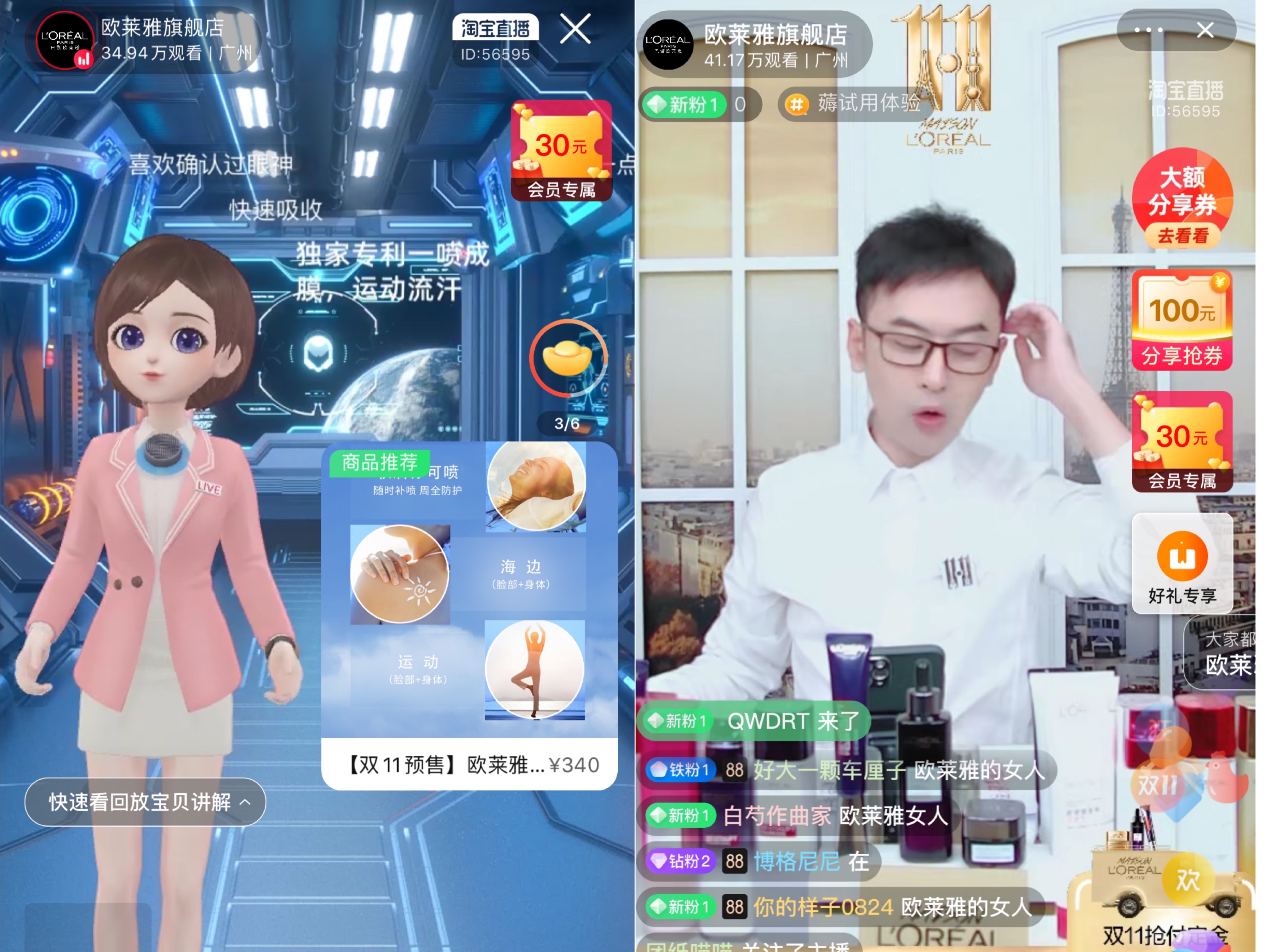 结合虚拟主播和真人主播,欧莱雅的店铺直播几乎达到24小时不间断的效果。任何时候进入欧莱雅品牌直播间,都可以领到专属优惠券。直播间观众还有一个专属昵称“欧莱雅的女人”,下单备注此暗号可以额外领到一份赠品。