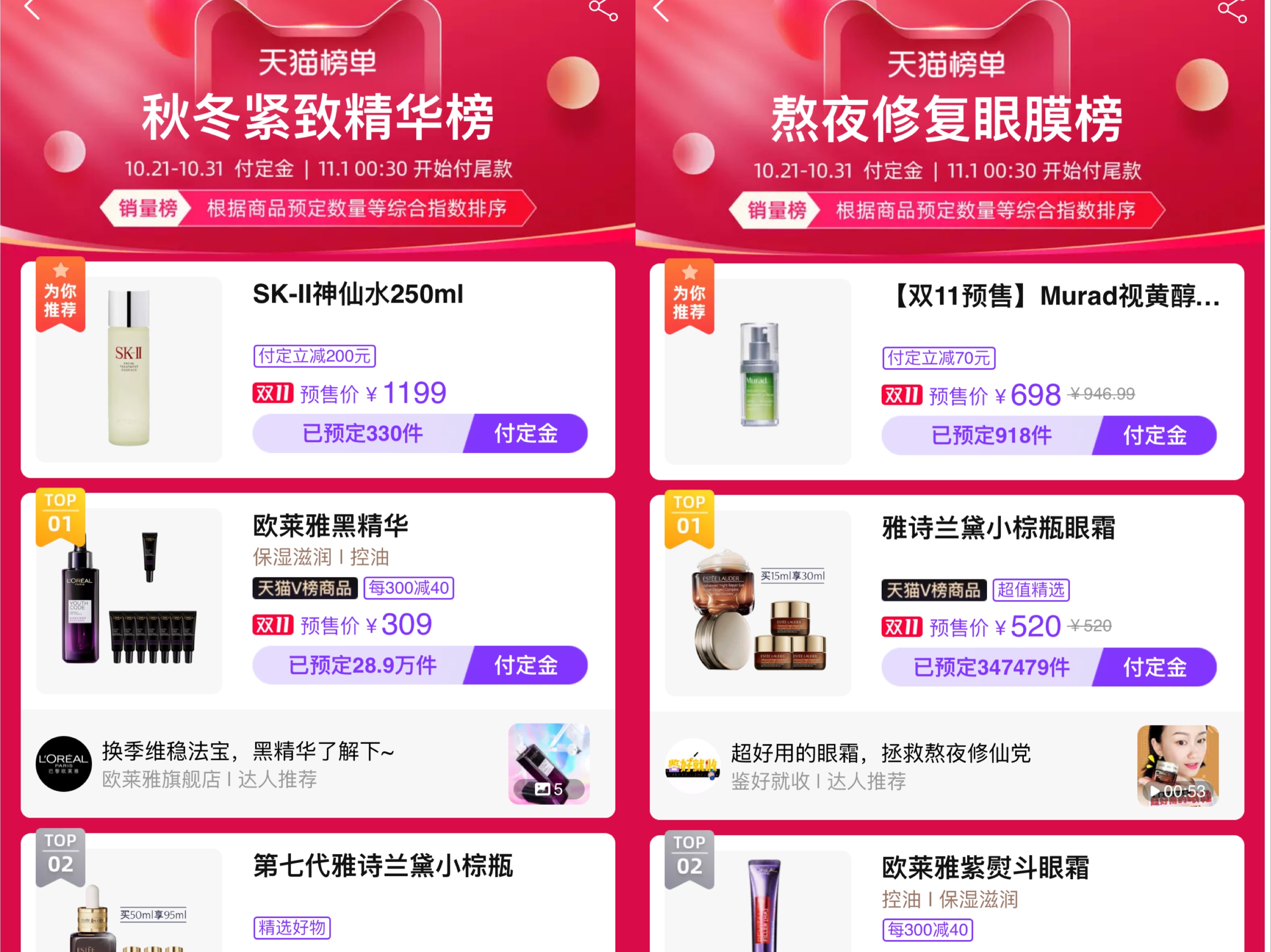 根据天猫官方发布的榜单,包括安瓶面膜、紫熨斗眼霜和黑精华3个单品都入选双11美妆类目的各项细分榜单。其中,安瓶面膜是天猫保湿面膜回购榜第3名;紫熨斗眼霜是熬夜修复眼膜榜第2名,欧莱雅黑精华是天猫秋冬紧致精华销量榜第1名。