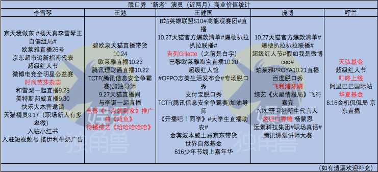 据不完全统计(近两月内),目前王建国已顺利拿下12家直播商演、或广告代言;庞博次之,以接下10家品牌活动暂列第二;呼兰是今年刚刚凭借与周奇墨相爱相杀、真正走入大众视野中的“半新人”脱口秀演员,其在今年接下来的8家品牌活动,虽不算多,但也高于去年同期。