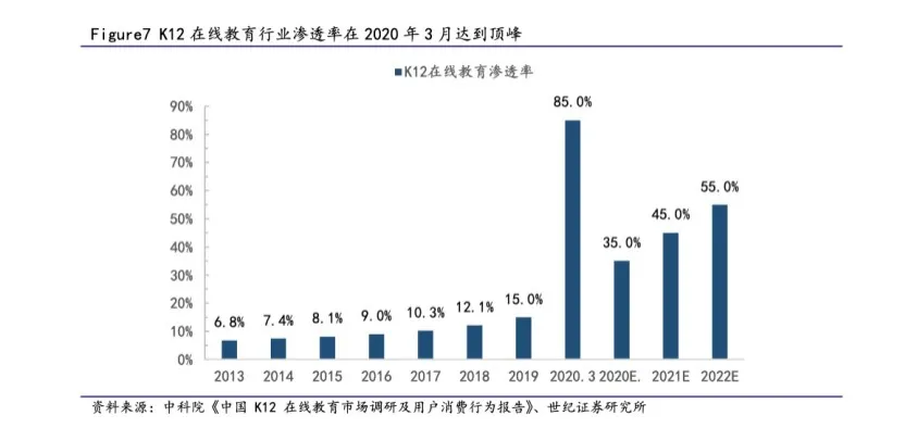 据中科院报告,K12在线教育行业渗透今年3月达到顶峰,为85%,并预测到2022年将突破55%。