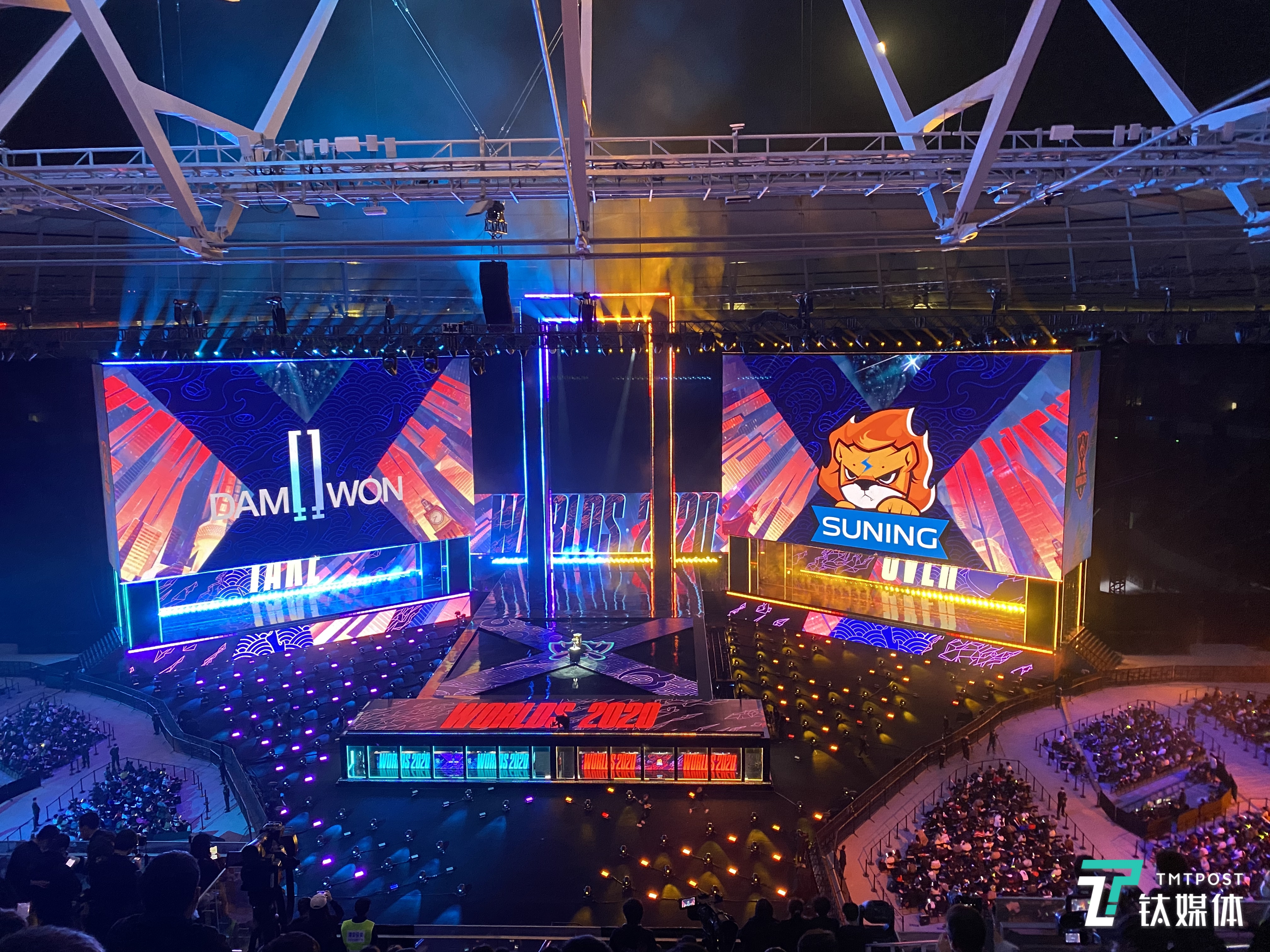S10开幕式后,现场两块LED屏映着DWG和SN两支战队的名字,很巧的是,这两支进入决赛的战队都以他们背后的企业名命名:DamWon是韩国一家专门经营耳机、显示器、座椅等游戏类外设的公司,而另一块屏上的小狮子和“SUNING”,明显能让所有看比赛的人想到苏宁这家公司。