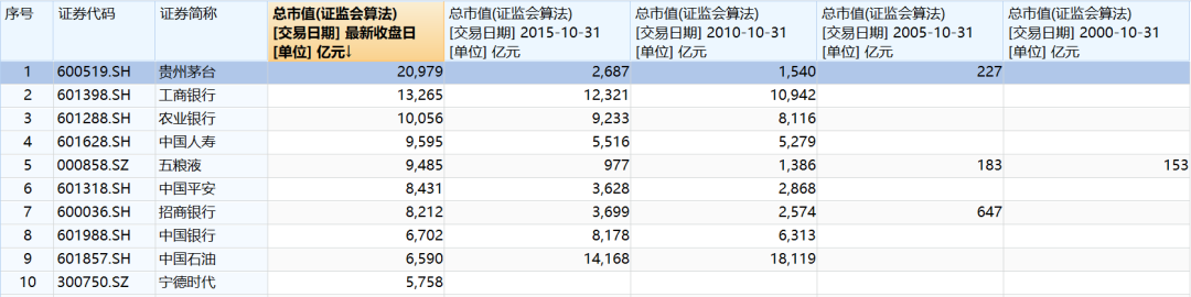 从Wind统计2000年-2020年的A股十大权重,以五年为周期,浦发银行、中国石化、中国石油、中国石油和贵州茅台各领风骚。