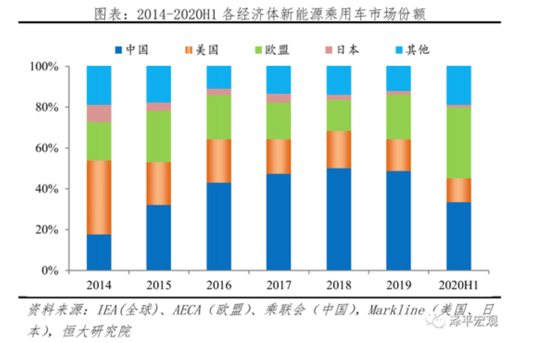 据 Markline 统计,2020 年上半年全球新能源乘用车(BEV+PHEV)销 量为 97.4 万辆,欧盟地区市场份额 2020 年上半年剧增,从 2019 年 21.9%直接提 升到 2020 年上半年 34.7%,市场份额反超中国;中国地区市场份额从 2018 年 50.2%下滑到 2019 年 48.8%、2020 上半年 33.5%。