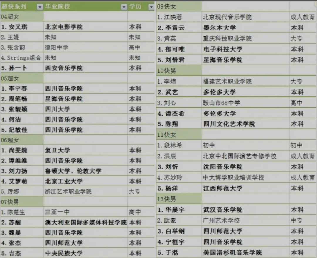 比如,饭圈词汇"九漏鱼"——九年义务教育的漏网之鱼,形容的就是未完成初中学业就入行的练习生和偶像。在此前文章《年龄越来越小,学历越来越低,偶像到底该如何培养?》中,音乐先声就发现,从超女时代到101系列,选秀选手们的年龄在变小,学历也渐渐从本科变为高中,甚至出现了初中、小学辍学投入练习的孩子。某种程度上,随着准入门槛越来越低,选手的素质也不断降低,"学艺先学德"也成为舆论场中老生常谈的话题。