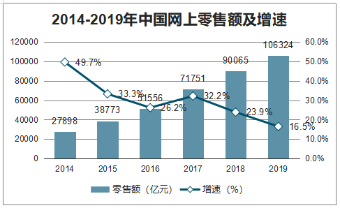根据智研咨询数据,2014-2019年,线上零售总额虽然持续增长,但是增速总体下滑,增速放缓。