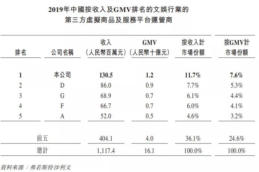 咨询机构弗若斯特沙利文的数据显示,2014年至2019年中国虚拟商品及服务市场规模复合年增长率达14.9%,文娱板块更是高达113.1%。2019年,文娱占第三方虚拟商品及服务平台运营市场总额的约4%,GMV达到人名币161亿元。