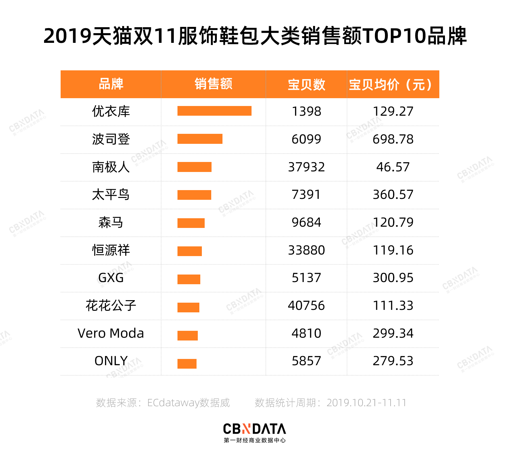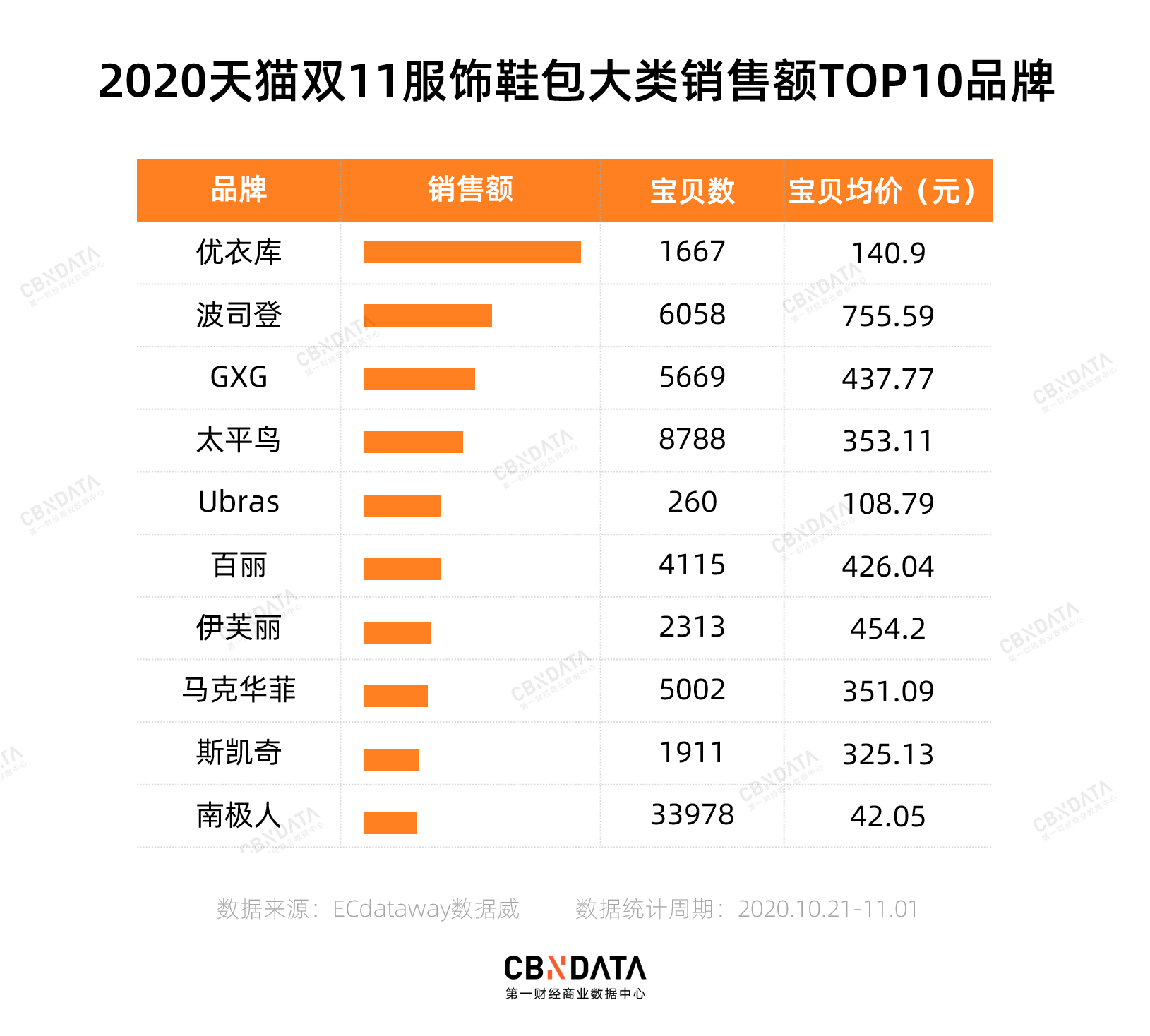 往年上榜双11服饰鞋包TOP10的品牌,要么客单价较高(例如波司登),要么拥有数量惊人的SKU(例如南极人)。但今年的榜单,却挤进了一个女性内衣品牌Ubras——客单价百元出头,SKU不到南极人1%,销售额却位列全品类第五,预售期间(10.21-10.31)更是名列第二。