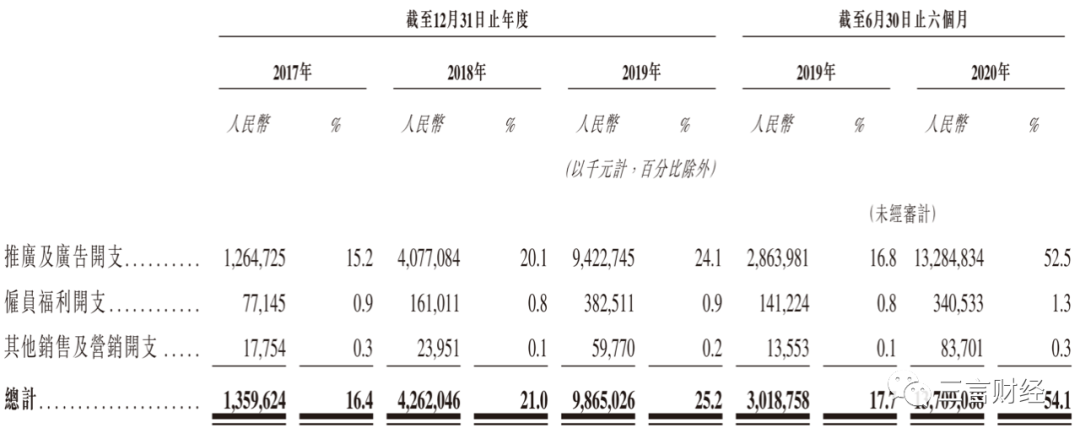 招股书显示,截止至2020年6月30日,快手推广及广告开支达到132.4亿元,占总收入比例为52.5。而2017年至2019年该项支出分别为12.6亿元、40.8亿元、94.2亿元和28.6亿元,占总收入比例分别为15.2%、20.1%、24.1%和16.8%。
