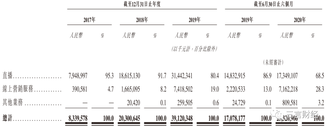 根据招股书,截止至2020年6月30日止,直播业务收入带来173亿元,占总收入68.5%;线上营销服务收入带来71.6亿元,占总收入28.3%;其他业务收入为8.1亿元,占总收入3.2%。