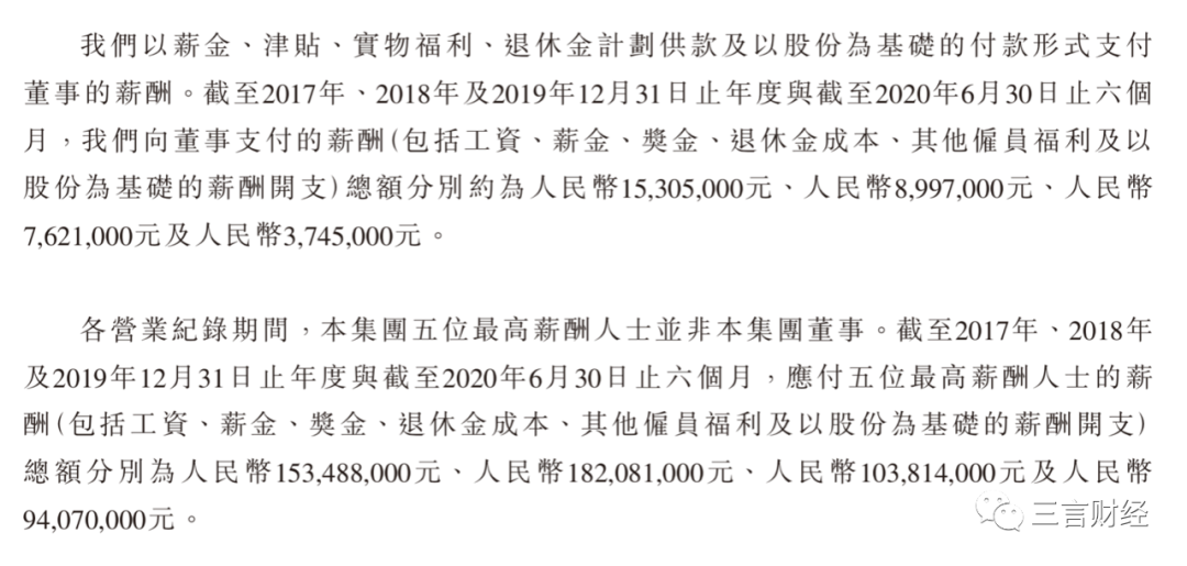 截至2017年、2018年、2019年及2020年6月30日止六个月,公司应付五位最高薪酬人士且非公司董事薪酬总额分别为1.5亿元、1.8亿元、1.03亿元以及9400万元。(注:上述“薪酬”包含工资、薪金、奖金、退休金成本、其他雇员福利及以股份为基础的薪酬开支。)