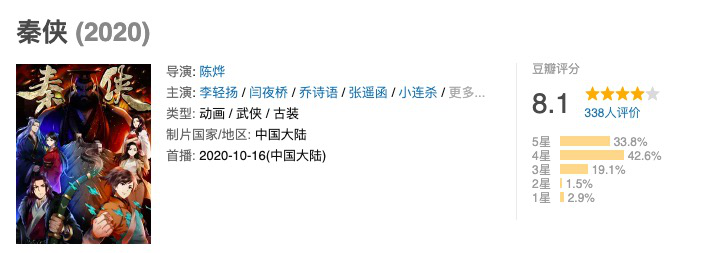 同时,《秦侠》在B站外也获得粉丝认可,该作品豆瓣评分达到8.1分,有豆瓣网友评价道,“细节和画面风格太对胃口了,还是喜欢2D,这是第一部古穿今的国产动画吧,每周一集甚至不够看。”