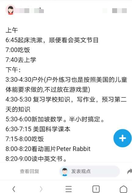 上午:早上6:45起床洗漱、7:40去上学;下午:3:303:30-4:30户外(注:体能要求)、4:30-5:30复习与预习、5:50-6:00新加坡数学、6:30-7:15美国科学、 7:15-8:00吃饭、8:00-8:20英文动画片、8:20-9:00英文书。