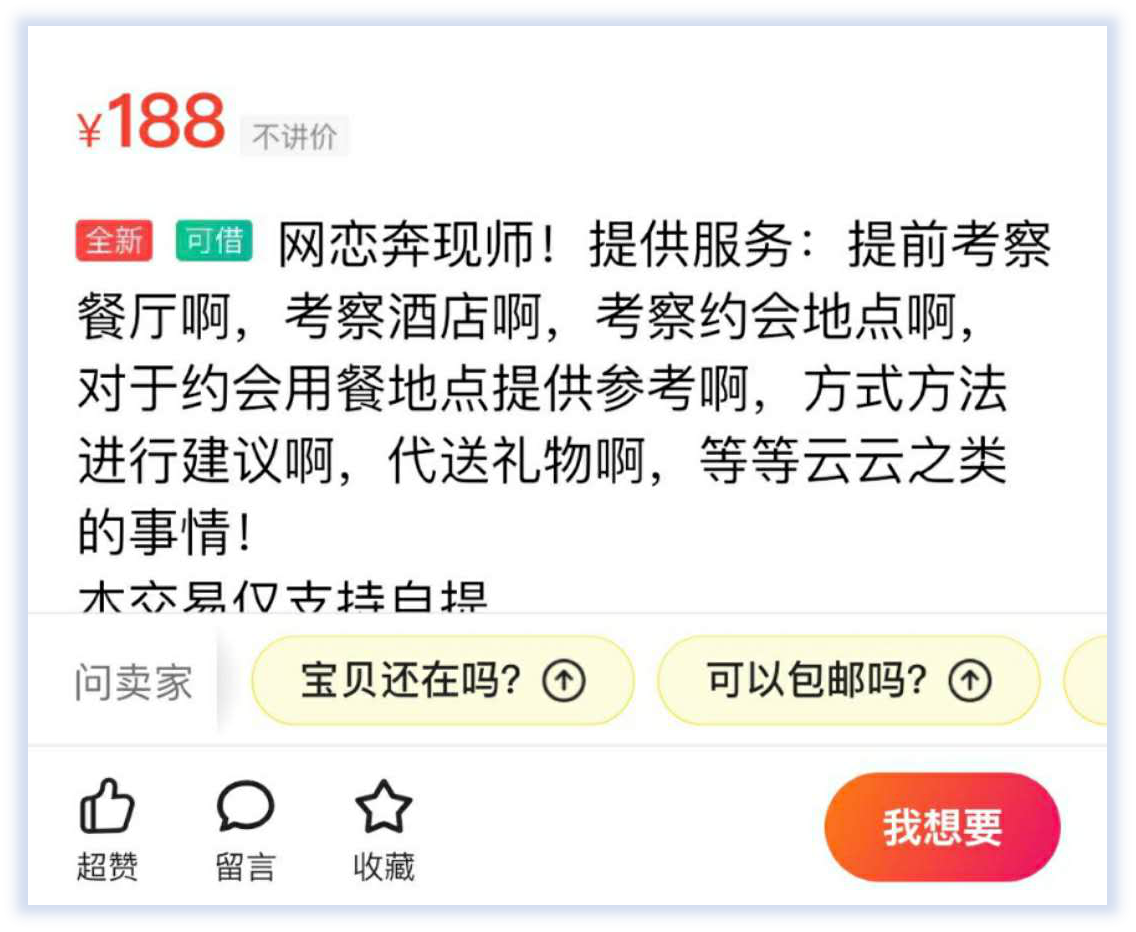 有需求就会有市场。除了麻烦买卖小哥,近一段时间以来,网络上也开始出现了很多“网络奔现师”。无论电商平台还是社区论坛,你都能发现“网络奔现师”的踪影。懂懂笔记在几家主流电商及二手交易平台上,找到了几十条声称可以提供“代考察”、“代奔现”的“网络奔现师”信息,其中一位“网络奔现师”描述了自己对于这份工作的理解和实践。