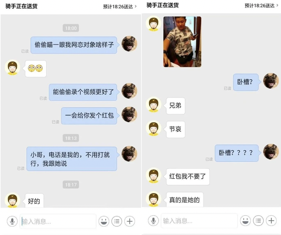 一位用户下单为女网友叫外卖,希望外卖小哥在送达时帮忙看一眼“女网友”是否漂亮,表示事后会给外卖小哥发红包。当外卖送达时,小哥惊奇地发现开门取外卖的居然是一名膀大腰圆的女汉子,他十分同情下单的用户,告知对方后连红包也不收了。